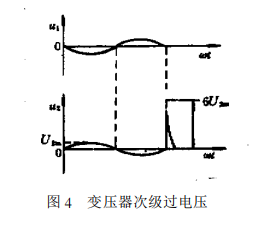 另一方面,直流屏變壓器交流側(cè)也會(huì)由于大容量負(fù)載如大變比變壓器的合閘瞬間、其它負(fù)載切斷電源時(shí)以及整流變壓器電刀閘的開關(guān)斷開,也會(huì)由于初次級(jí)繞組間的分布電容,變壓器的激勵(lì)電流的突變?cè)诖渭?jí)產(chǎn)生瞬時(shí)過電壓,其尖峰值可達(dá)工作電壓峰值的6倍以上,如圖4所示。