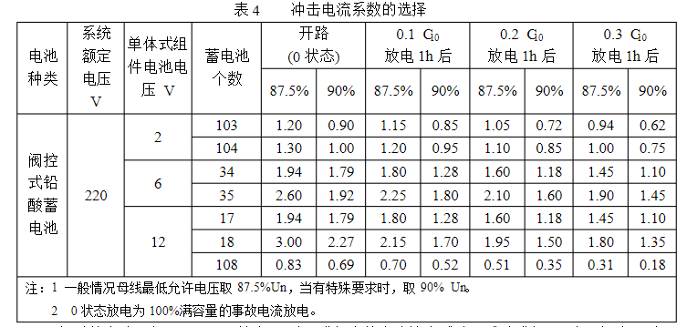 鉛酸蓄電池的事端放電能力試驗(yàn)的沖擊電流應(yīng)根據(jù)蓄電池放電狀況、放電的停止電壓和蓄電池組的個(gè)數(shù)來(lái)挑選,其事端放電沖擊電流系數(shù)由表4來(lái)確認(rèn)。