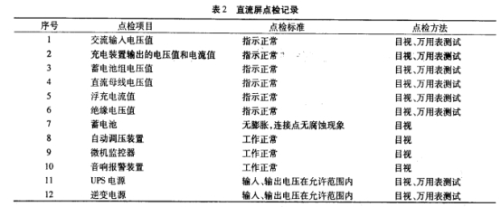 首要需求編制點(diǎn)檢標(biāo)準(zhǔn),編制出符合實(shí)際出產(chǎn)需求的點(diǎn)檢標(biāo)準(zhǔn),使其他點(diǎn)檢者能快速、簡(jiǎn)潔履行點(diǎn)檢標(biāo)準(zhǔn)。點(diǎn)檢標(biāo)準(zhǔn)的內(nèi)容觸及方面比較多,列入點(diǎn)檢處理規(guī)模的部位也比較多,例如直流屏,交流輸入電壓值、充電設(shè)備輸出的電壓值和電流值、蓄電池組電壓值、直流母線電壓值、浮充電流值、絕緣電壓值、蓄電池、主動(dòng)調(diào)壓設(shè)備、微機(jī)監(jiān)控器、音響報(bào)警設(shè)備、UPS電源、逆變電源等都是關(guān)系到直流屏安全作業(yè)的重要參數(shù)及設(shè)備,確認(rèn)為點(diǎn)檢部位。點(diǎn)檢部位確認(rèn)后,就要履行點(diǎn)檢內(nèi)容,點(diǎn)檢辦法現(xiàn)在還是以簡(jiǎn)單東西、儀器和人的感觀為主的點(diǎn)檢辦法。因而,點(diǎn)檢內(nèi)容首要是檢查設(shè)備溫度、電壓、表計(jì)指示、作業(yè)情況等方面參數(shù)。直流屏設(shè)備點(diǎn)檢作業(yè)首要是以日常點(diǎn)檢為主,守時(shí)點(diǎn)檢為輔。日常點(diǎn)檢首要以人的感官為主,通過(guò)聽(tīng)、摸、看.擰等辦法對(duì)作業(yè)中的設(shè)備進(jìn)行一個(gè)外觀的檢查。通過(guò)每日進(jìn)行的點(diǎn)檢作業(yè),及時(shí)發(fā)現(xiàn)設(shè)備存在的風(fēng)險(xiǎn)并消除,使設(shè)備長(zhǎng)周期安全作業(yè)。由于直流屏的特殊性,展開(kāi)的直流屏設(shè)備專業(yè)點(diǎn)檢也很重要,點(diǎn)檢辦法以工用具、表面和人的感觀為主的點(diǎn)檢辦法。通過(guò)守時(shí)進(jìn)行的點(diǎn)檢作業(yè),及時(shí)發(fā)現(xiàn)設(shè)備存在的風(fēng)險(xiǎn)并消除,使設(shè)備長(zhǎng)周期安全作業(yè),見(jiàn)表2。