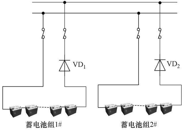 在外部交流供電異常時(shí),蓄電池組由連接在直流屏正極與蓄電池組正極之間的大功率二極管VD1/VD2無(wú)縫對(duì)負(fù)載進(jìn)行供電。放電通道并聯(lián)等效電路如圖4所示。在電池組并聯(lián)時(shí),即便兩組電池存在電壓差,高電壓蓄電池組與低電壓蓄電池組之間也不導(dǎo)通,不存在充電回路,故避免了環(huán)流現(xiàn)象的產(chǎn)生。